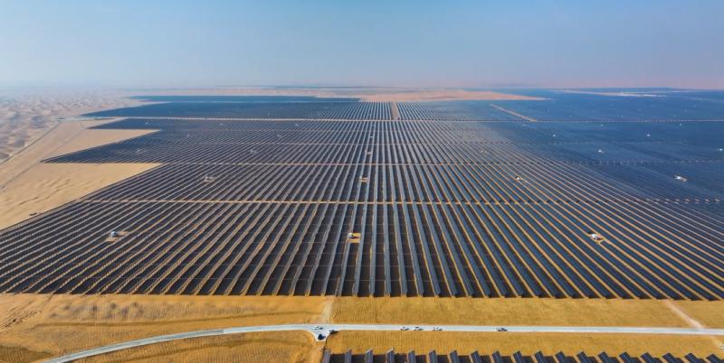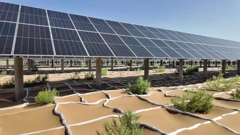 在內(nèi)蒙古華電騰格里清潔能源外送基地,建成的200萬(wàn)千瓦光伏項(xiàng)目正將清潔能源輸送入網(wǎng)。該項(xiàng)目因地制宜采用“光伏+治沙”的形式,通過(guò)板上發(fā)電、板下修復(fù)、板間種植,在治理沙地的同時(shí)促進(jìn)節(jié)能降耗,實(shí)現(xiàn)生態(tài)、經(jīng)濟(jì)效益的有機(jī)統(tǒng)一。