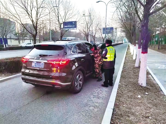 12月20日17時(shí)15分,九原區(qū)交管大隊(duì)第三警務(wù)區(qū)執(zhí)勤民警正駕駛警車(chē)在轄區(qū)巡邏清理違停車(chē)輛,當(dāng)巡邏至緯四路與經(jīng)二路交叉口時(shí),他們發(fā)現(xiàn)一輛黑色越野車(chē)停在緯四路非機(jī)動(dòng)車(chē)道內(nèi)且打著雙閃?!翱吹杰?chē)打著雙閃燈,想著可能是車(chē)上的人有啥困難,我們就把警車(chē)開(kāi)到附近,看到一名年輕男子正在車(chē)周?chē)辜钡貋?lái)回徘徊,神情特別緊張?!眻?zhí)勤民警說(shuō)。
