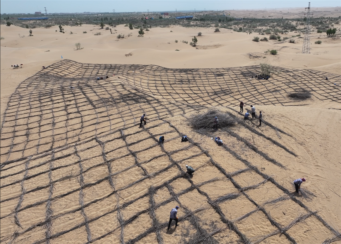 在鄂爾多斯市庫布其沙漠S215穿沙公路沙化土地綜合治理項(xiàng)目現(xiàn)場(chǎng),工人正在固定沙障。(資料圖)