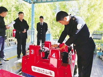 阿爾泰游樂園年接待游客量達30萬人次以上,有特種設備23臺(套),其中A類設備7套,包含過山車、豪華雙層轉(zhuǎn)馬、旋轉(zhuǎn)搖擺傘,高空飛翔等。在對過山車檢查時,執(zhí)法人員先后對特種設備使用、日常保養(yǎng)和定期檢驗、操作管理人員持證等情況進行檢查。