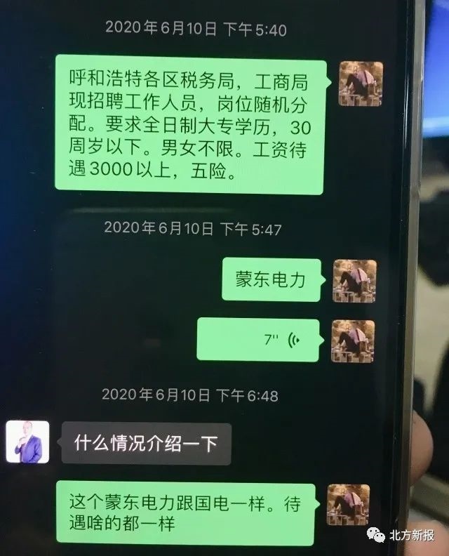 “呼和浩特各區(qū)消防大隊(duì)招聘辦公室內(nèi)勤人員,工資待遇3500元左右?!薄案咚俳痪羰兄ш?duì)(一支隊(duì))輔警,工資和五險(xiǎn)一金,4200元?!薄昂艉秃铺馗鲄^(qū)稅務(wù)局、工商局現(xiàn)招聘工作人員,崗位隨機(jī)分配。”“呼和浩特婦幼保健院招聘護(hù)士,大專學(xué)歷”……記者在民警繳獲的程某某的手機(jī)上看到,6月8日以來,程某某和趙某某的聊天記錄中,發(fā)送了多條諸如此類的招聘信息。