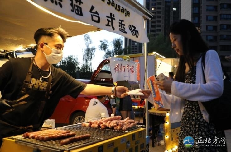 人間煙火氣,最撫凡人心。雖然已是21時許,但是后備廂集市依然人頭攢動,熱鬧非凡,叫賣聲不絕于耳。一家烤腸攤位前,攤主郭浩楠一邊招呼食客,一邊拿著夾子不緊不慢地翻動著烤架上的烤腸,烤好后拿竹簽一穿,伴著滋滋作響的聲音,紅光透亮的烤腸瞬間香氣四溢。“已經(jīng)參加了好幾場了,一晚上能售出近百根烤腸,不過我的初衷不是為了賺錢,就是想把自己鐘情的美食分享給大家。”郭浩楠說。