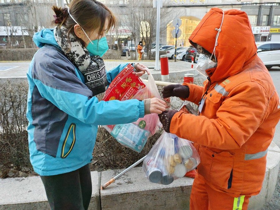 大家身穿志愿者馬甲,三五人一組結(jié)伴走上街頭,只要見到正在工作的環(huán)衛(wèi)工人,就會遞上一份節(jié)日暖心包,里面有臘八粥、小點心、春聯(lián)福字、兔年吉祥物裝飾卡片,還有酒精、口罩等防疫物資。
