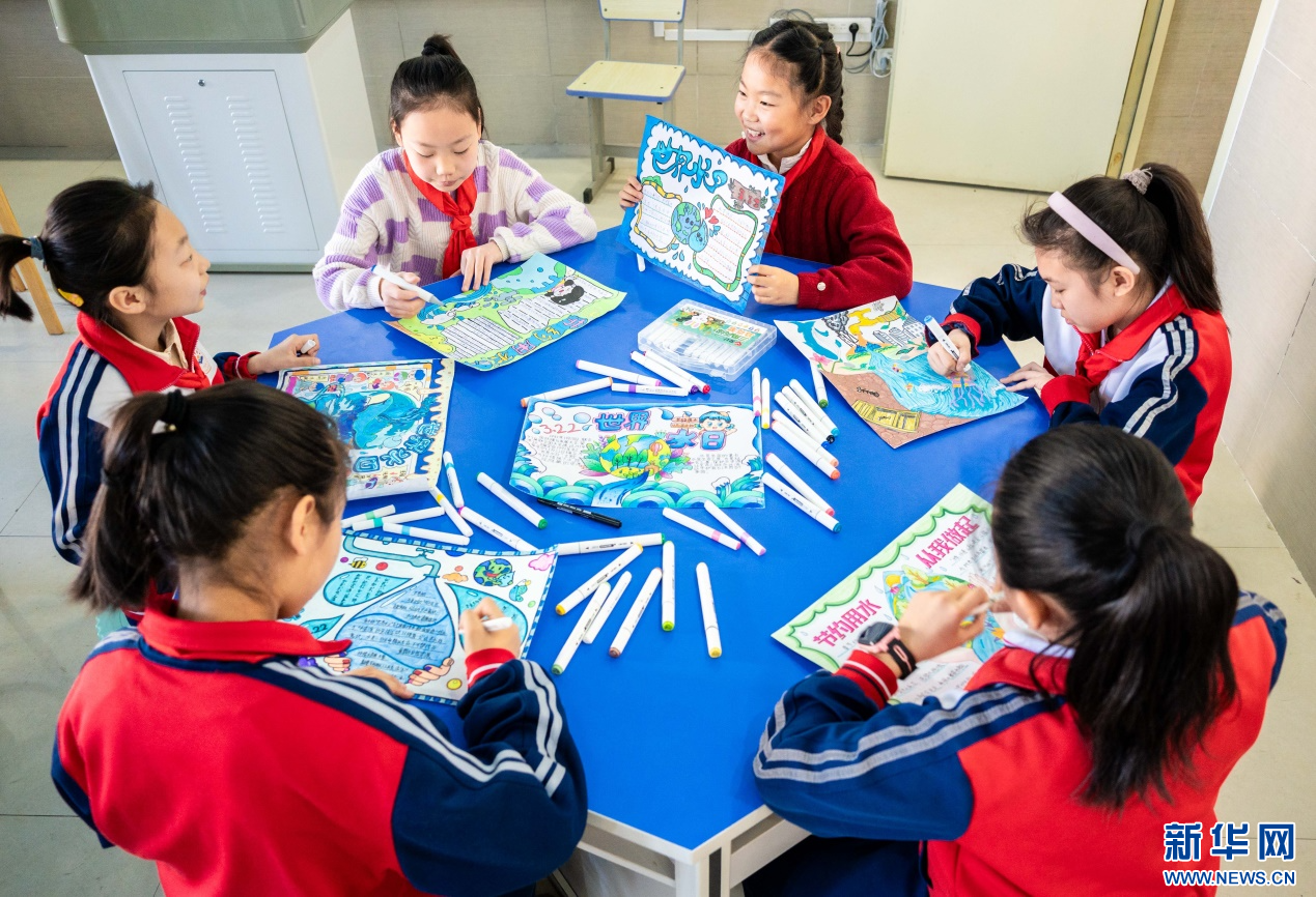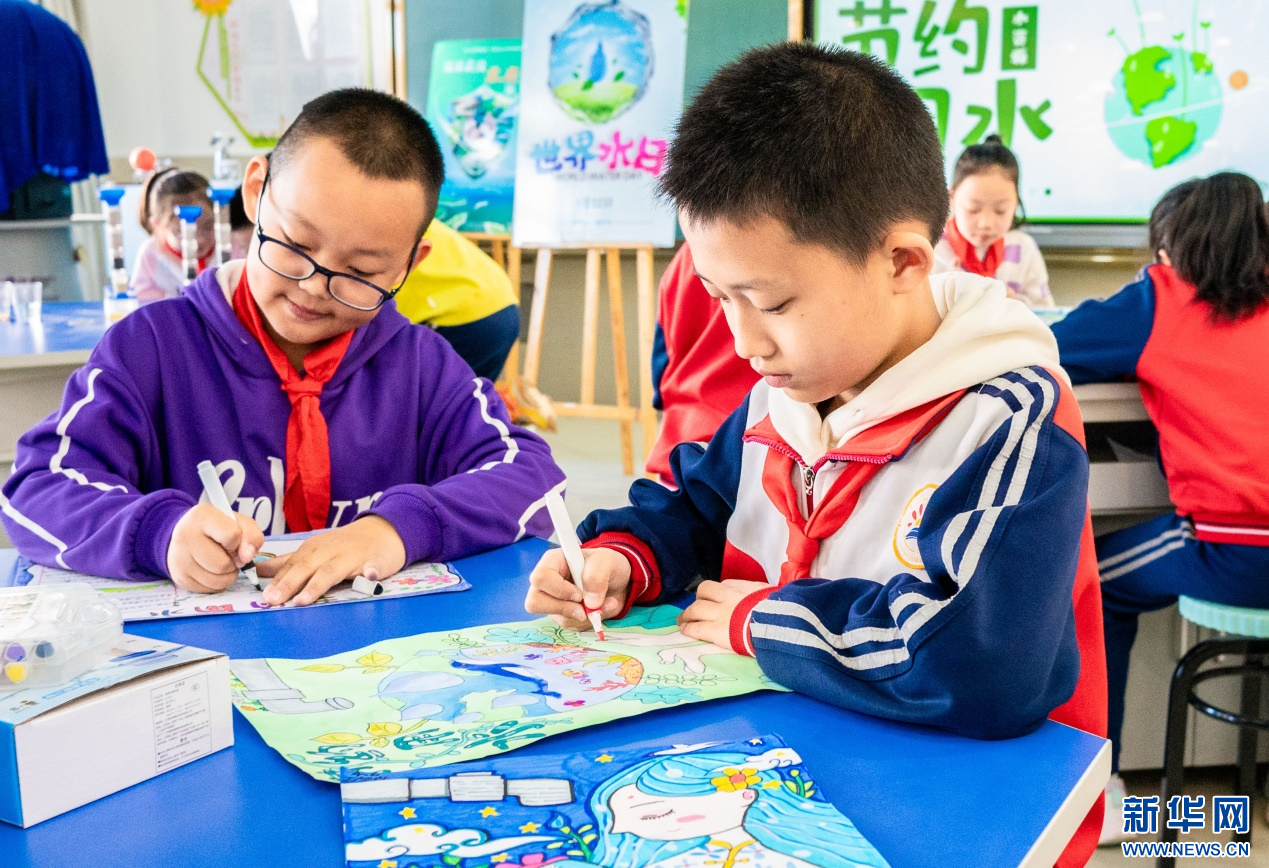 ??3月20日,呼和浩特市玉泉區(qū)石東路小學(xué)學(xué)生在繪制愛水護(hù)水手抄報(bào)。新華網(wǎng)發(fā)(丁根厚 攝)