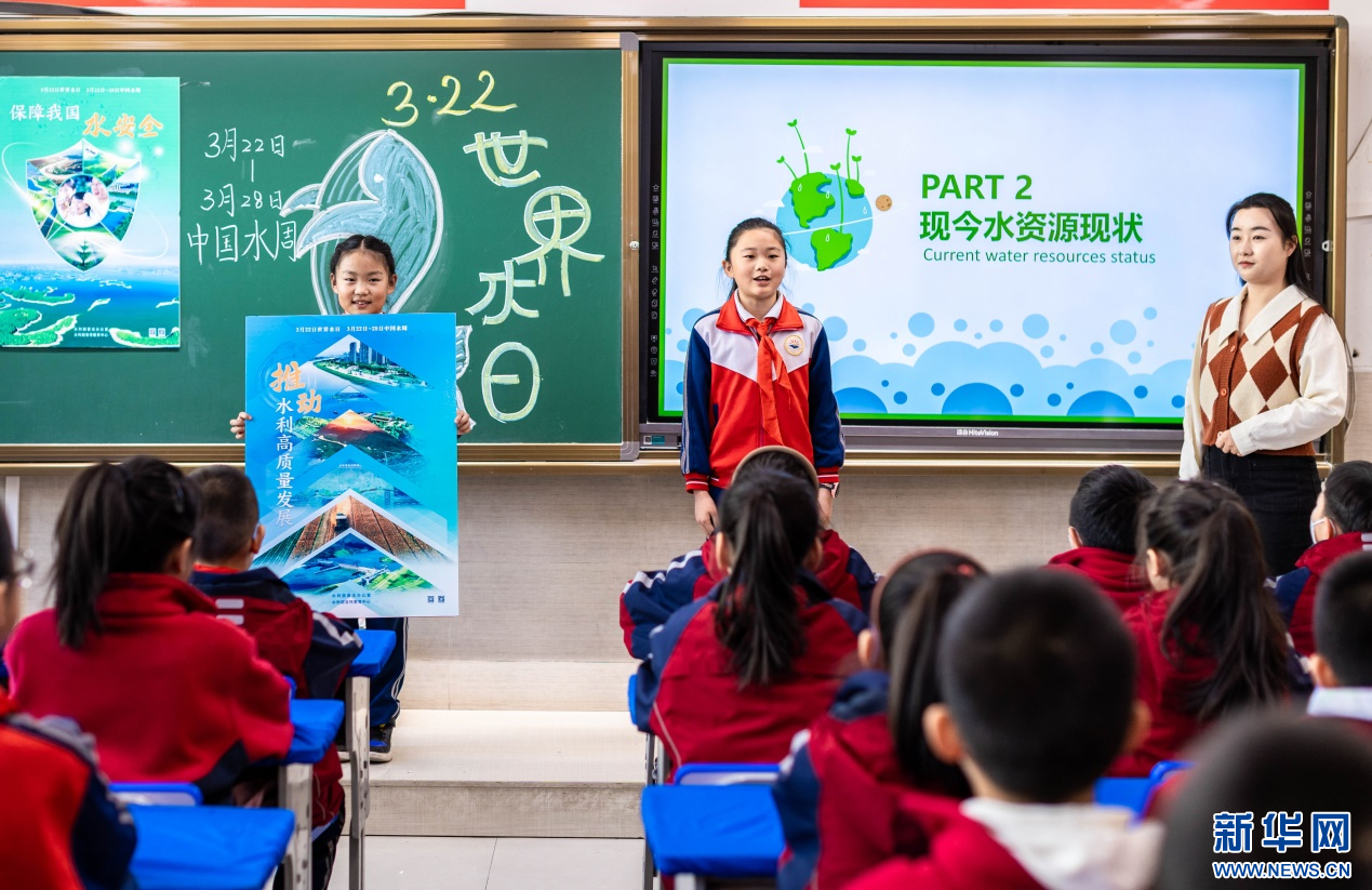 ??3月20日,呼和浩特市玉泉區(qū)石東路小學(xué)老師向?qū)W生們講解“保障我國水安全”等知識(shí)。新華網(wǎng)發(fā)(丁根厚 攝)