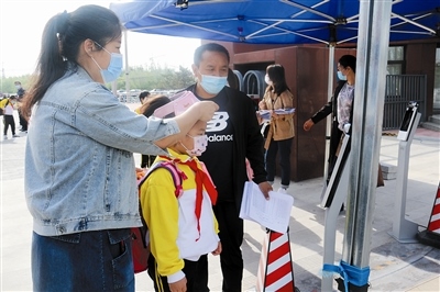 “等了這么久,終于可以和同學(xué)們說句:早上好?!?月2日,早上7點剛過,通遼新城第一中學(xué)小學(xué)部二年一班的班主任崔老師早早的在校門口,迎接班里的小朋友們。記者在校門口看到,此時,小學(xué)部二、三年級的小朋友已經(jīng)陸續(xù)入校了,顯然,“萌娃”們已經(jīng)被校門口的層層關(guān)卡震撼到了,幸好,在眾多老師的幫助和指引下順利進(jìn)入了校門。進(jìn)入了校門后,還有一道重要關(guān)卡,測量體溫,習(xí)慣了伸出手臂來測量體溫的“萌娃”們,對著紅外線測溫儀卻不知所措了,有的對著測溫儀伸出了手臂、有的對著測溫儀行禮,著實“萌”翻了現(xiàn)場所有人?!按蘩蠋煟覀兌枷肽懔??!币姷綆孜恍∨笥岩獪惖礁皟?,崔老師立刻提醒同學(xué)們:我也很想念你們,但是我們要保持“一米”的距離,快去教室吧!小朋友們被“殘忍”拒絕,很是失落。