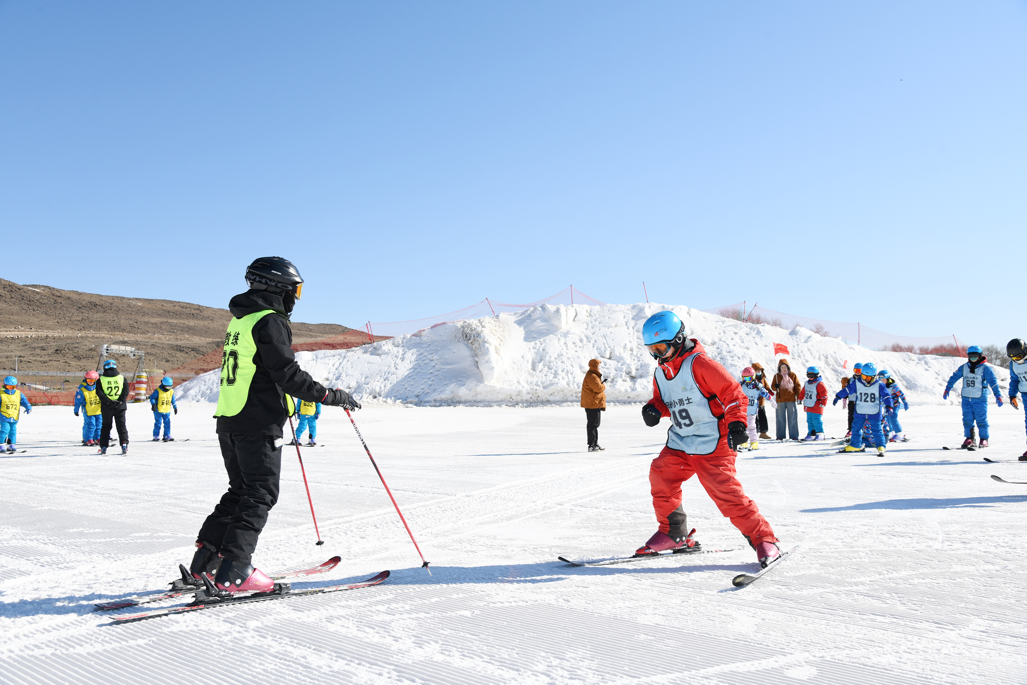 “把腳尖對準雪板凹槽,腳后跟用力下踩?!薄半p腿呈‘V’字形,與肩同寬,掌握好平衡?!倍顮I學員在烏蘭察布日光火山大河灣滑雪度假區(qū)專業(yè)教練的悉心指導下,從最基礎的穿戴裝備學起,逐漸掌握了犁式轉彎、半犁式轉彎等技巧。經過一個多小時的學習和鍛煉,有一定基礎的學員已經可以在雪道上腳踏雪板飛馳而下,并流暢地完成大回轉等動作;有的學員偶爾摔倒,也會迅速起身繼續(xù)訓練。