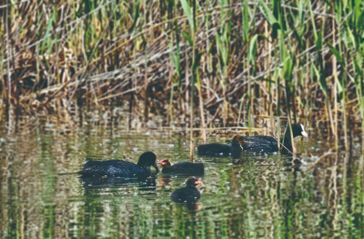 在不遠處的水域,白骨頂雞一家成為眾人關(guān)注的焦點。幾只剛剛出窩的幼鳥,圓滾滾、毛茸茸的,正好奇地在水中游動,動作略顯笨拙,還不時發(fā)出稚嫩的叫聲。成年白骨頂雞則忙著覓食,它們一頭扎進水里,再浮出水面時,嘴里已叼著小魚小蝦,隨后快速游向幼鳥喂食。幼鳥們爭搶食物的場景,充滿了趣味。