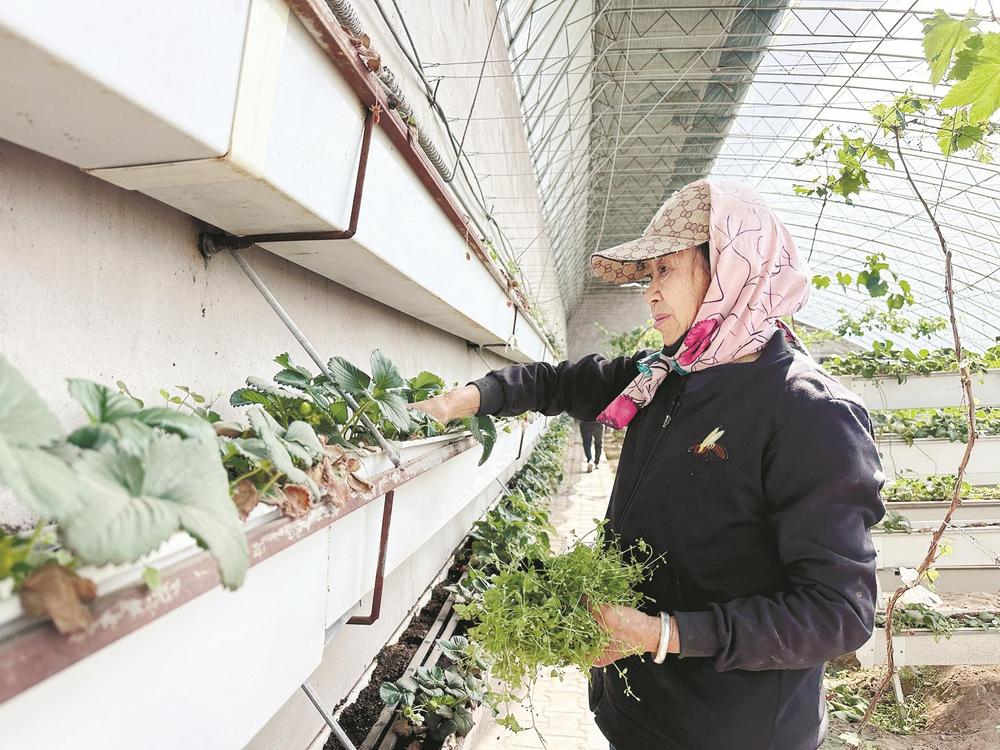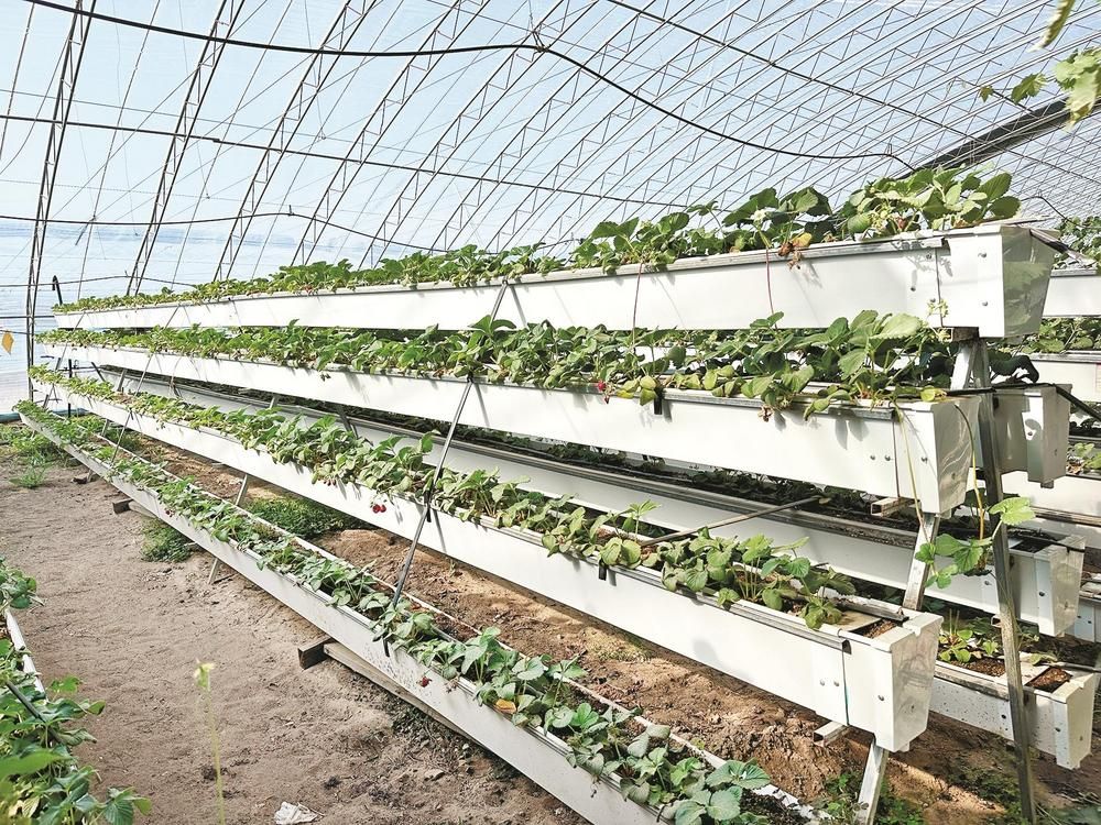 走進(jìn)草莓大棚內(nèi),濃濃的暖意撲面而來(lái)。抬眼望去,離地一米多的種植架上種滿了生機(jī)勃勃、長(zhǎng)勢(shì)喜人的草莓;穿梭在種植架間,一顆顆鮮紅欲滴、圓潤(rùn)飽滿的草莓宛如璀璨的紅寶石,從綠葉間“探出頭”來(lái),高高地懸掛在空中,散發(fā)著誘人的清香。種植戶牛尚海正在察看采用立體栽培技術(shù)的草莓長(zhǎng)勢(shì)情況。“這是一種三維立體種植方式,能夠充分利用空間和光照,大幅度提高生產(chǎn)效率。以前一畝地最多種8000株,現(xiàn)在能種2.4萬(wàn)株,產(chǎn)量提高了3倍,而且草莓個(gè)頭更均勻,賣相更好?!迸I泻8嬖V記者,這種種植方式不僅省工、省力,還降低了勞動(dòng)強(qiáng)度,摘草莓也不用彎腰了。此外,這種種植模式比傳統(tǒng)種植模式每畝節(jié)水50%。