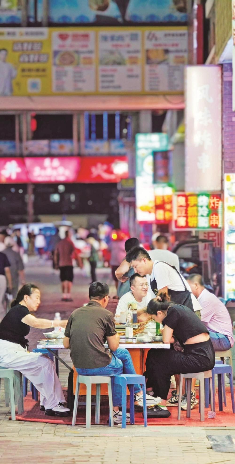 炭火上的羊肉串嗞嗞作響,油脂滴落,迸出金色火花,散發(fā)出誘人的香氣??腿藝谒芰闲∽琅裕掷锬弥?zhèn)啤酒,碰杯傳出清脆的響聲……這里沒(méi)有高檔餐廳的拘謹(jǐn),只有朋友相聚的歡樂(lè)和大口吃肉的暢快。大學(xué)生徐瑞虹放暑假后,經(jīng)常和朋友來(lái)夜市消暑。“我們幾個(gè)沒(méi)事就來(lái)萬(wàn)達(dá)金街轉(zhuǎn)一轉(zhuǎn),天太熱了,待在家里也悶,而且夜市里的這些小吃我們都比較喜歡,沒(méi)事幾個(gè)人喝幾瓶啤酒,聊一聊天,感覺(jué)還是很愜意的?!睂?duì)于年輕人來(lái)說(shuō),夜市不僅是美食的聚集地,更是釋放壓力、享受生活的好去處。在這里,他們可以暫時(shí)拋開(kāi)煩惱,盡情享受美食帶來(lái)的快樂(lè)。