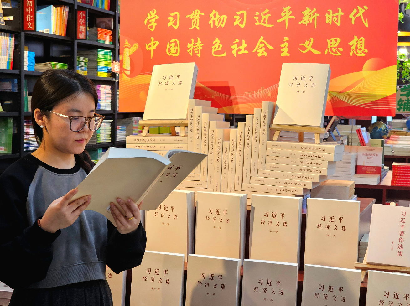 市民殷玥琳正在閱讀《習(xí)近平經(jīng)濟(jì)文選》第一卷
