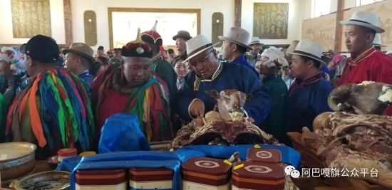 早上八點整,別力古臺祭祀以傳統(tǒng)的蒙古族祭祀儀軌進行。上千民眾身著盛裝,從旅游度假區(qū)的正門排成數(shù)列長隊,每支隊伍最前面的代表托舉著盛有“術(shù)思”(整羊)的大木盤,依次步入祭祀宮。祭祀活動正式開始,信眾們紛紛獻上手中的貢品和哈達,他們神情莊重,十分虔誠的向別力古臺頂禮膜拜,祈禱草原風(fēng)調(diào)雨順,五畜興旺。