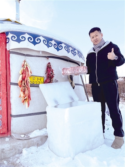 12月8日,記者幾經(jīng)周折與視頻中的小伙張智磊取得了聯(lián)系。張智磊今年36歲,從小在錫林郭勒大草原長(zhǎng)大,在當(dāng)?shù)刂饕雠Q蛉馍?。?duì)于意外走紅,張智磊直言自己也沒(méi)有想到。“視頻是在錫林浩特市南郊向陽(yáng)村叔叔家院子里的蒙古包拍攝的。記得小時(shí)候,每到冬天,周邊牧民都是把食物埋在雪地里儲(chǔ)存。我前幾天也拍了一個(gè)從雪地里找羊腿的視頻,有粉絲留言‘放在雪地里會(huì)不會(huì)忘記位置容易丟了’,然后我就突發(fā)奇想,干脆做個(gè)‘冰箱’把年貨放進(jìn)去?!睆堉抢诟嬖V記者,他從12月3日開(kāi)始凍冰塊,12月4日把凍結(jié)實(shí)的冰塊拿出來(lái)用冷水黏合,因?yàn)楸鶋K低于0攝氏度,遇水就會(huì)瞬間黏在一起,然后開(kāi)始著手打磨,棱棱角角都用電熨斗熨平整,再加上蓋,一個(gè)“冰箱”就完成了。