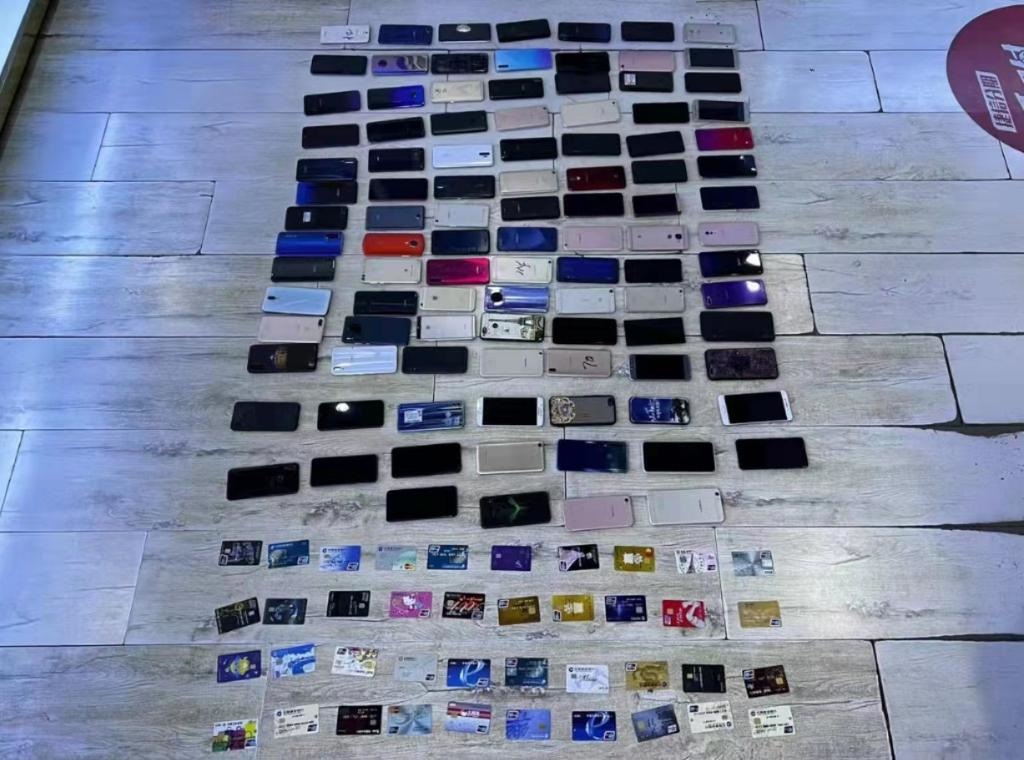 這是民警現場查扣的手機、銀行卡等部分作案工具。(受訪單位供圖)