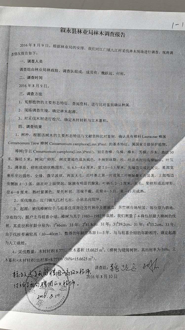 敘永縣林業(yè)局出具的報(bào)告顯示,涉案香樟樹為人工栽植。圖片來源/受訪者供圖