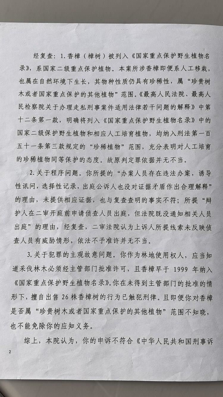 一審判決下達(dá)后,馬萬林及謝某林均提出上訴。瀘州市中院在二審時(shí)沿用了敘永縣法院一審判決所適用法律規(guī)定,同時(shí)認(rèn)為所砍伐的26棵香樟樹屬于自然環(huán)境內(nèi)生長,即便是人工移栽也未改變自然環(huán)境對(duì)香樟成長的決定性影響。香樟樹無論是野生還是人工培育,均未改變其物種性質(zhì),同樣具有珍稀性,系國家禁止、限制出口的珍稀植物,屬于刑法第三百四十條規(guī)定的“珍貴樹木或者國家重點(diǎn)保護(hù)的其他植物?!币虼耍R萬林、謝某林認(rèn)為人工栽植的香樟不屬于國家重點(diǎn)保護(hù)植物的上訴理由不能成立,該院不予支持。