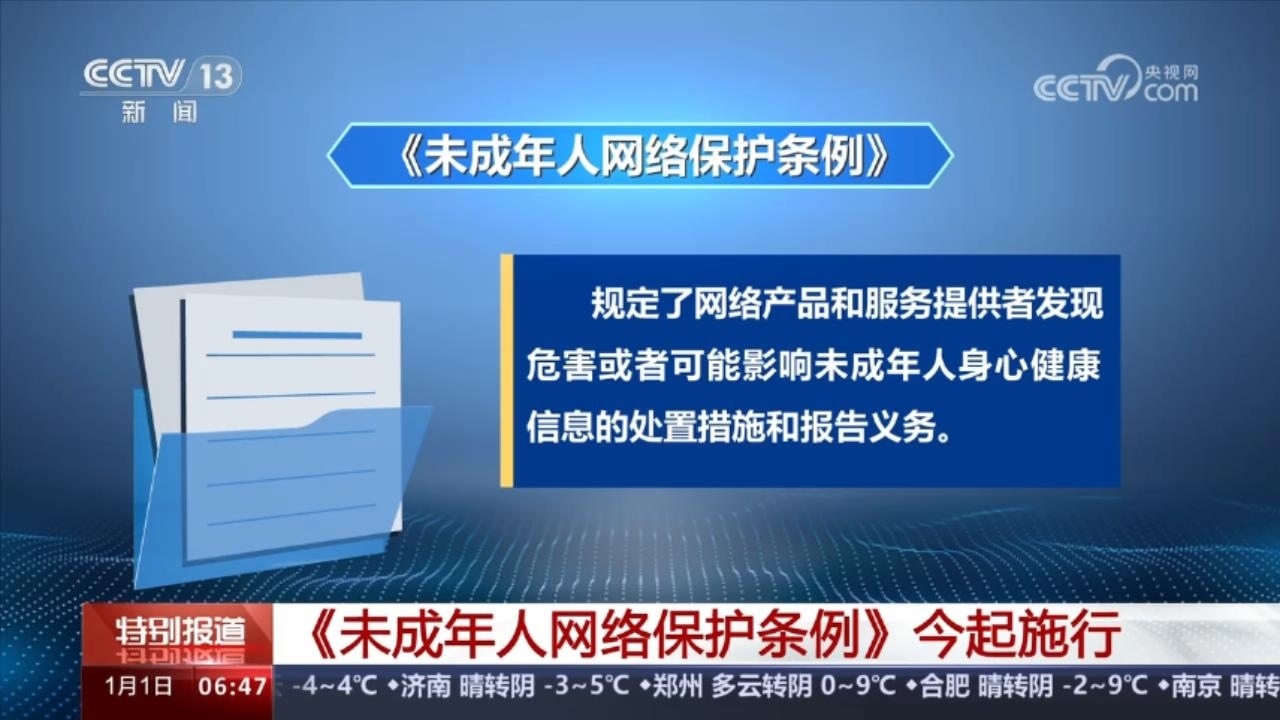 1月1日起施行的《未成年人網(wǎng)絡(luò)保護(hù)條例》是我國第一部專門性的未成年人網(wǎng)絡(luò)保護(hù)綜合立法。條例規(guī)定,網(wǎng)絡(luò)產(chǎn)品和服務(wù)提供者發(fā)現(xiàn)危害或者可能影響未成年人身心健康信息的處置措施和報(bào)告義務(wù)。