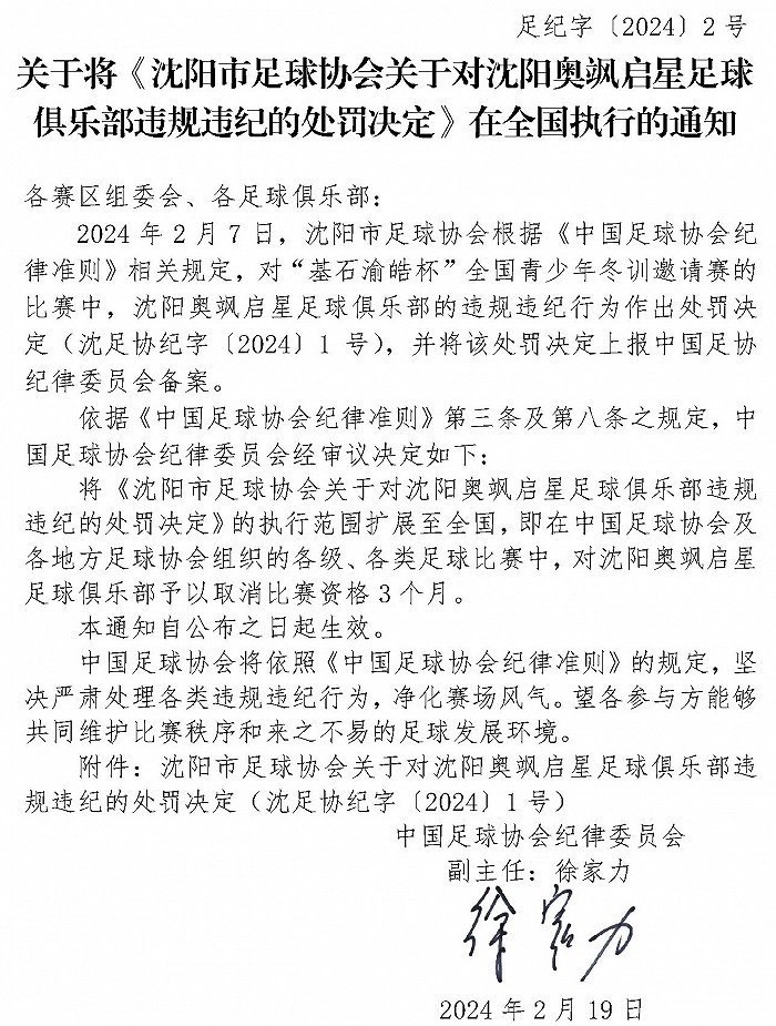 央視網(wǎng)消息:據(jù)中國(guó)足球協(xié)會(huì)2月21日發(fā)布通知,將《沈陽市足球協(xié)會(huì)關(guān)于對(duì)沈陽奧颯啟星足球俱樂部違規(guī)違紀(jì)的處罰決定》及《遼寧省足球運(yùn)動(dòng)協(xié)會(huì)關(guān)于對(duì)教練員吳高俊違規(guī)違紀(jì)的處罰決定》在全國(guó)執(zhí)行,具體內(nèi)容如圖: