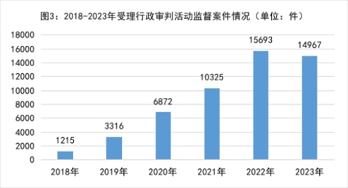 3.行政審判活動監(jiān)督更有實效。2018年以來受理行政審判活動監(jiān)督案件分別是:2018年1215件、2019年3316件、2020年6872件、2021年10325件、2022年15693件,年均增加89.6%。經(jīng)過連續(xù)五年監(jiān)督,監(jiān)督效果初步體現(xiàn)。2023年共受理14967件,同比下降4.6%。其中,依職權(quán)受理占95.5%;依申請受理占4.5%。針對超期立案、超期審理、違反規(guī)定送達(dá)法律文書等審判程序違法問題,向法院提出檢察建議13491件,同比下降6.8%。