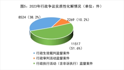 5.行政爭議實質(zhì)性化解持續(xù)深化做實。針對司法實踐中一些行政案件程序已結(jié)但訟爭未解的“程序空轉(zhuǎn)”“案結(jié)事不了”等問題,2023年共促進(jìn)案涉行政爭議實質(zhì)性化解22310件,同比上升26%。其中,行政生效裁判監(jiān)督案件8524件,占38.2%;行政審判活動監(jiān)督案件2269件,占10.2%;行政執(zhí)行活動(含非訴執(zhí)行)監(jiān)督案件11517件,占51.6%。