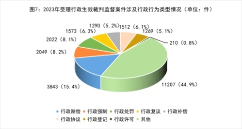 4.案涉行政行為類型中,行政賠償、行政強(qiáng)制、行政處罰等類案件占比較高,行政許可類案件處于低位。行政檢察監(jiān)督案件涉及的行政行為類型較為廣泛,從2023年行政生效裁判監(jiān)督案件情況看,涉及行政賠償類案件3843件、行政強(qiáng)制類案件2049件、行政處罰類案件2022件、行政復(fù)議類案件1573件、行政補(bǔ)償類案件1290件、行政協(xié)議類案件1512件、行政登記類案件1269件,這七類案件約占54.3%。特別指出的是,由于“放管服”改革的深入推進(jìn),近年來涉行政許可類行政生效裁判監(jiān)督案件始終處于低位,2023年辦理此類案件210件,占比僅為0.8%。