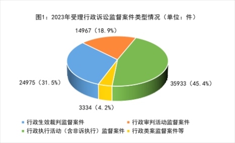 1.行政檢察監(jiān)督職能全面發(fā)展。一方面,訴訟內(nèi)監(jiān)督進(jìn)一步強(qiáng)化。2023年全國檢察機(jī)關(guān)共受理行政訴訟監(jiān)督案件79209件,其中,行政生效裁判監(jiān)督案件24975件,占比31.5%;行政審判活動監(jiān)督案件14967件,占比18.9%;行政執(zhí)行活動(含非訴執(zhí)行)監(jiān)督案件35933件,占比45.4%;行政類案監(jiān)督等案件3334件,占比4.2%。另一方面,“訴訟外”監(jiān)督實現(xiàn)新突破。2023年辦理行刑反向銜接案件中對被不起訴人應(yīng)受行政處罰的提出檢察意見11.3萬人,辦理行政違法行為監(jiān)督案件提出檢察建議3.2萬件。行政檢察各項職能發(fā)展更加全面、更加協(xié)調(diào)。針對行政訴訟、行政執(zhí)法和執(zhí)行活動存在的問題,以抗訴、檢察建議等方式提出監(jiān)督意見17.4萬件。