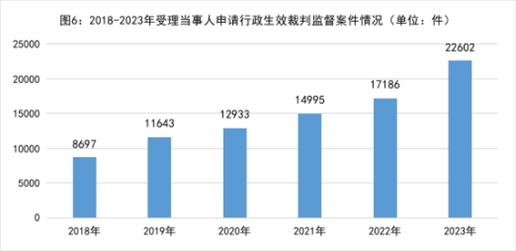 1.依申請監(jiān)督的行政生效裁判監(jiān)督案件數(shù)量逐年上升,反映出人民群眾對檢察監(jiān)督的更高需求。2018年以來當(dāng)事人不服法院生效裁判向檢察機(jī)關(guān)申請監(jiān)督的案件分別是:2018年8697件、2019年11643件、2020年12933件、2021年14995件、2022年17186件、2023年22602件,年均增加21%。2023年16個省級檢察院受理行政案件數(shù)超過民事案件。當(dāng)事人對裁判結(jié)果申請監(jiān)督的同時,很多情況下還對審判和執(zhí)行程序一并主張訴求,追求“看得見”的公平正義。