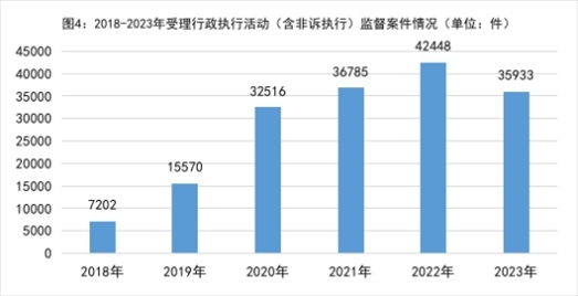 4.行政執(zhí)行活動監(jiān)督發(fā)展迅速,行政非訴執(zhí)行監(jiān)督占主導(dǎo)。2018年以來受理行政執(zhí)行活動(含非訴執(zhí)行)監(jiān)督案件分別是:2018年7202件、2019年15570件、2020年32516件、2021年36785件、2022年42448件,年均增加55.8%。2023年受理35933件,同比下降15.3%。其中,行政非訴執(zhí)行活動監(jiān)督34938件,占97.2%;行政訴訟執(zhí)行活動監(jiān)督995件,占2.8%。針對超期執(zhí)行、執(zhí)行裁定或決定違反法定程序、違法裁定終結(jié)本次執(zhí)行、怠于申請強(qiáng)制執(zhí)行等問題,向法院、行政機(jī)關(guān)提出檢察建議31790件,同比下降12.8%。