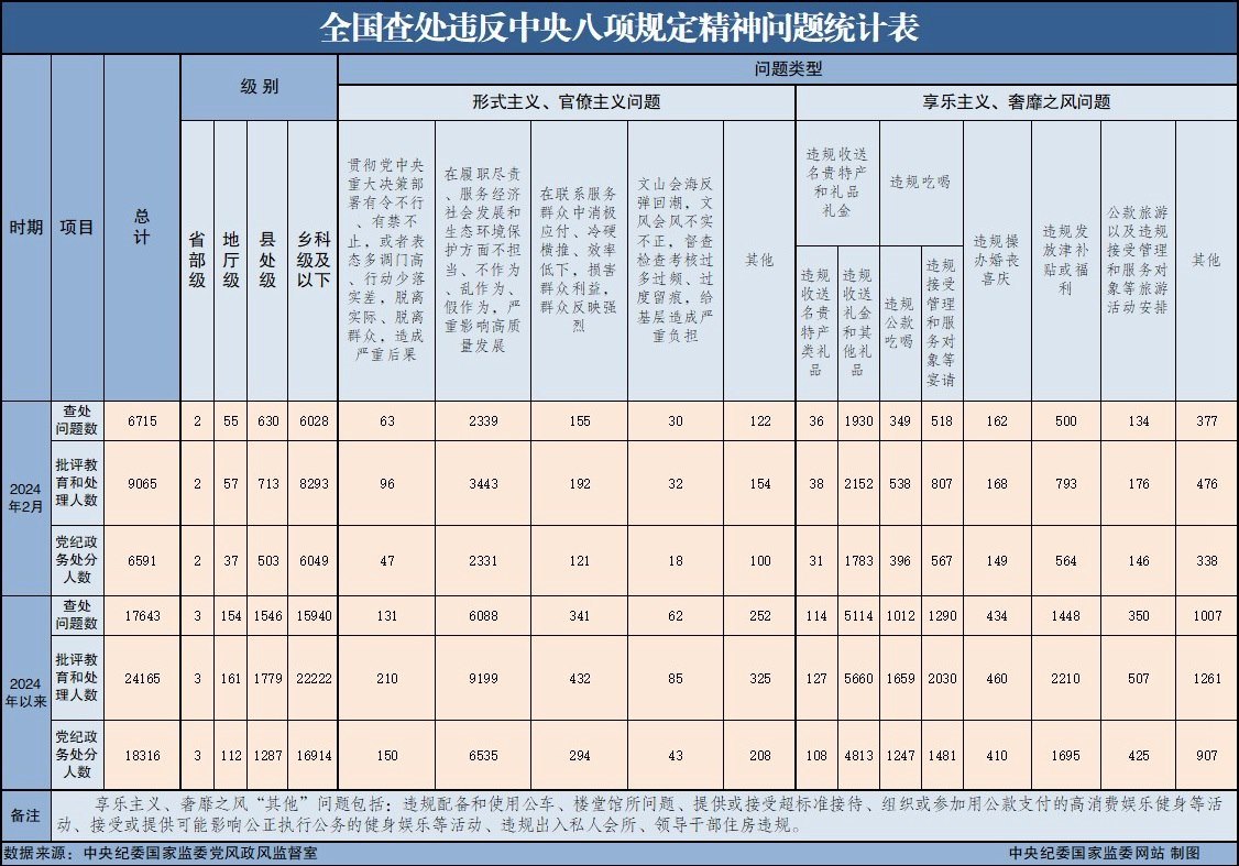 央視網(wǎng)消息:3月26日,中央紀(jì)委國(guó)家監(jiān)委公布了2024年2月全國(guó)查處違反中央八項(xiàng)規(guī)定精神問題匯總情況。當(dāng)月,全國(guó)共查處違反中央八項(xiàng)規(guī)定精神問題6715起,批評(píng)教育和處理9065人,其中黨紀(jì)政務(wù)處分6591人,這是連續(xù)第126個(gè)月公布月報(bào)數(shù)據(jù)。