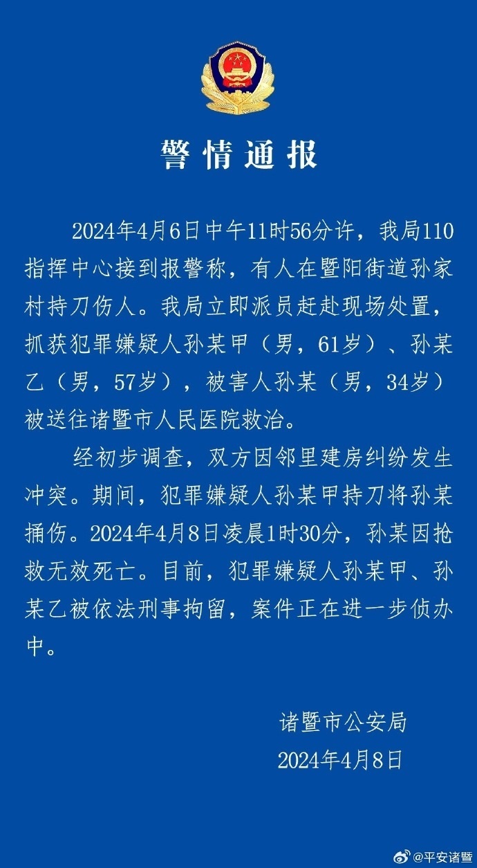 央視網(wǎng)消息:4月8日,浙江諸暨市公安局通報(bào):4月6日中午11時(shí)56分許,我局110指揮中心接到報(bào)警稱,有人在暨陽(yáng)街道孫家村持刀傷人。我局立即派員趕赴現(xiàn)場(chǎng)處置,抓獲犯罪嫌疑人孫某甲(男,61歲)、孫某乙(男,57歲),被害人孫某(男,34歲)被送往諸暨市人民醫(yī)院救治。經(jīng)初步調(diào)查,雙方因鄰里建房糾紛發(fā)生沖突。期間,犯罪嫌疑人孫某甲持刀將孫某捅傷。2024年4月8日凌晨1時(shí)30分,孫某因搶救無(wú)效死亡。目前,犯罪嫌疑人孫某甲、孫某乙被依法刑事拘留,案件正在進(jìn)一步偵辦中。