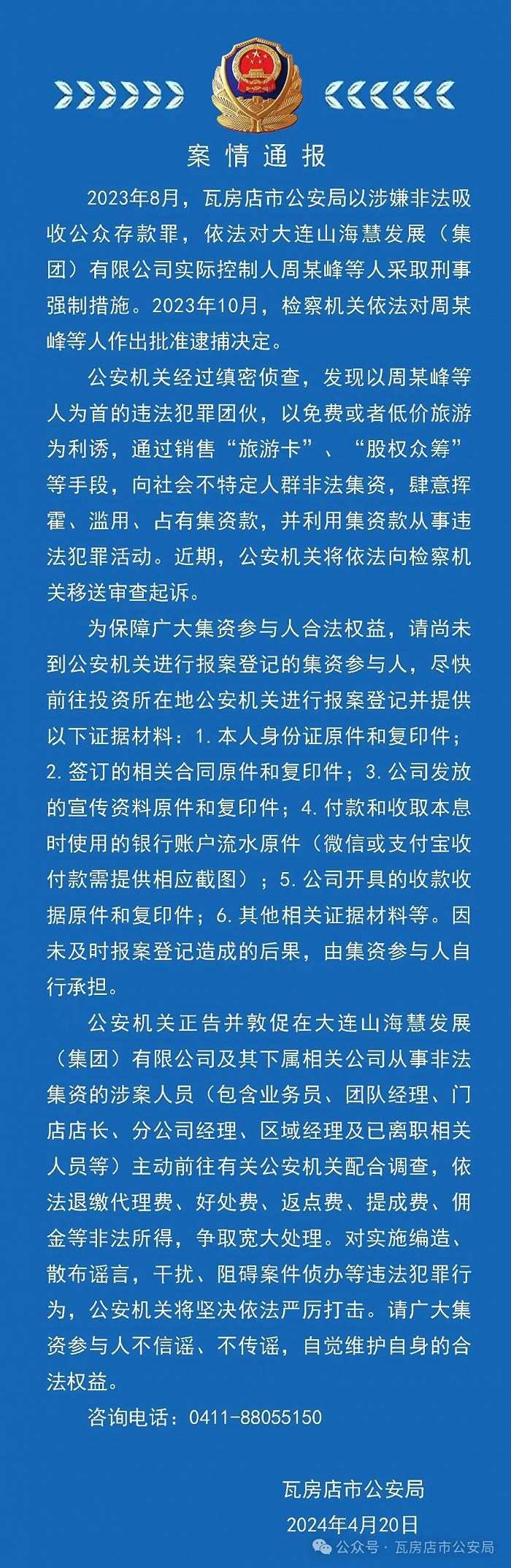 央視網(wǎng)消息:據(jù)瓦房店市公安局官微消息,遼寧瓦房店市公安局通報(bào),2023年8月,瓦房店市公安局以涉嫌非法吸收公眾存款罪,依法對大連山?;郯l(fā)展(集團(tuán))有限公司實(shí)際控制人周某峰等人采取刑事強(qiáng)制措施。2023年10月,檢察機(jī)關(guān)依法對周某峰等人作出批準(zhǔn)逮捕決定。公安機(jī)關(guān)經(jīng)過縝密偵查,發(fā)現(xiàn)以周某峰等人為首的違法犯罪團(tuán)伙,以免費(fèi)或者低價(jià)旅游為利誘,通過銷售“旅游卡”、“股權(quán)眾籌”等手段,向社會不特定人群非法集資,肆意揮霍、濫用、占有集資款,并利用集資款從事違法犯罪活動。近期,公安機(jī)關(guān)將依法向檢察機(jī)關(guān)移送審查起訴。