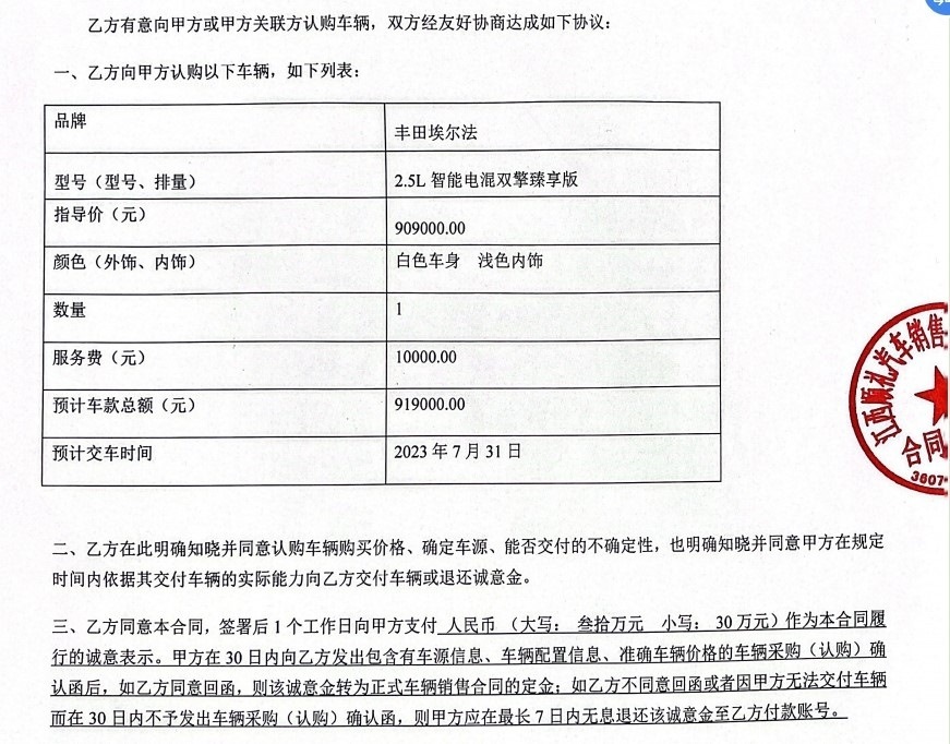 豐田埃爾法汽車,預(yù)計(jì)車款總額91.9萬元,其中車輛指導(dǎo)價(jià)90.9萬元,服務(wù)費(fèi)1萬元,預(yù)計(jì)交車時(shí)間為2023年7月31日。簽訂認(rèn)購(gòu)合同當(dāng)天,任先生支付了30萬元誠(chéng)意金。