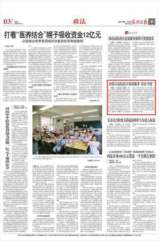2025年8月12日,《法治日報(bào)》第3版刊發(fā)題為《內(nèi)蒙古法院設(shè)立訴訟服務(wù)“涉企專線”》的文章,報(bào)道了自治區(qū)高院在全區(qū)法院集中開展規(guī)范涉企執(zhí)法司法專項(xiàng)行動(dòng)以來,全區(qū)法院認(rèn)真查糾立案環(huán)節(jié),全面查糾案件審理,深入開展“公開透明 規(guī)范高效”提升年行動(dòng)。