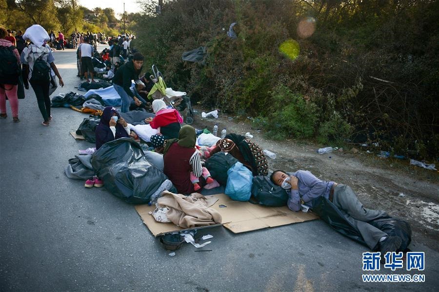 9月9日,在希臘萊斯沃斯島,發(fā)生火災后逃離莫里亞難民營的難民和非法移民在路邊休息。新華社發(fā)(帕納吉奧提斯·帕拉斯卡斯攝)