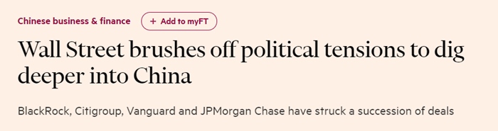 “華爾街部分實力最雄厚的金融機構正在加緊布局中國的基金管理業(yè)等金融服務業(yè),以期獲利于中國走向開放的資本市場。”