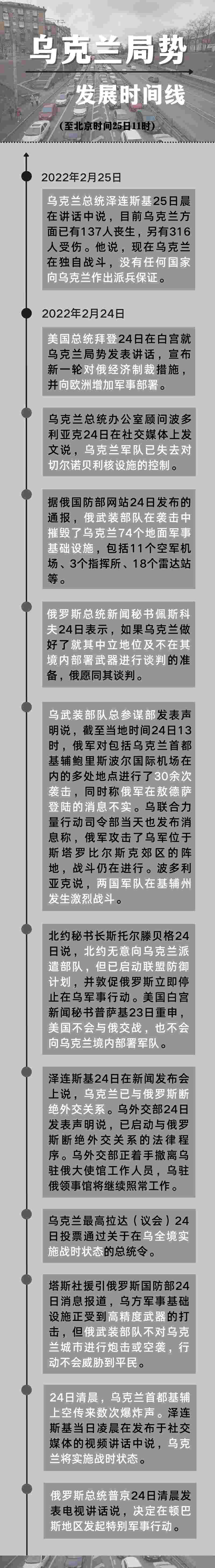 新華社北京2月25日電 自俄羅斯軍隊(duì)24日晨在頓巴斯地區(qū)發(fā)起特別軍事行動(dòng)以來(lái),俄軍對(duì)多處地點(diǎn)進(jìn)行了襲擊。俄方表示,如烏克蘭做好就其中立地位及不在其境內(nèi)部署武器進(jìn)行談判的準(zhǔn)備,俄愿同其談判。以下為截至目前的重要節(jié)點(diǎn)時(shí)間線(xiàn):