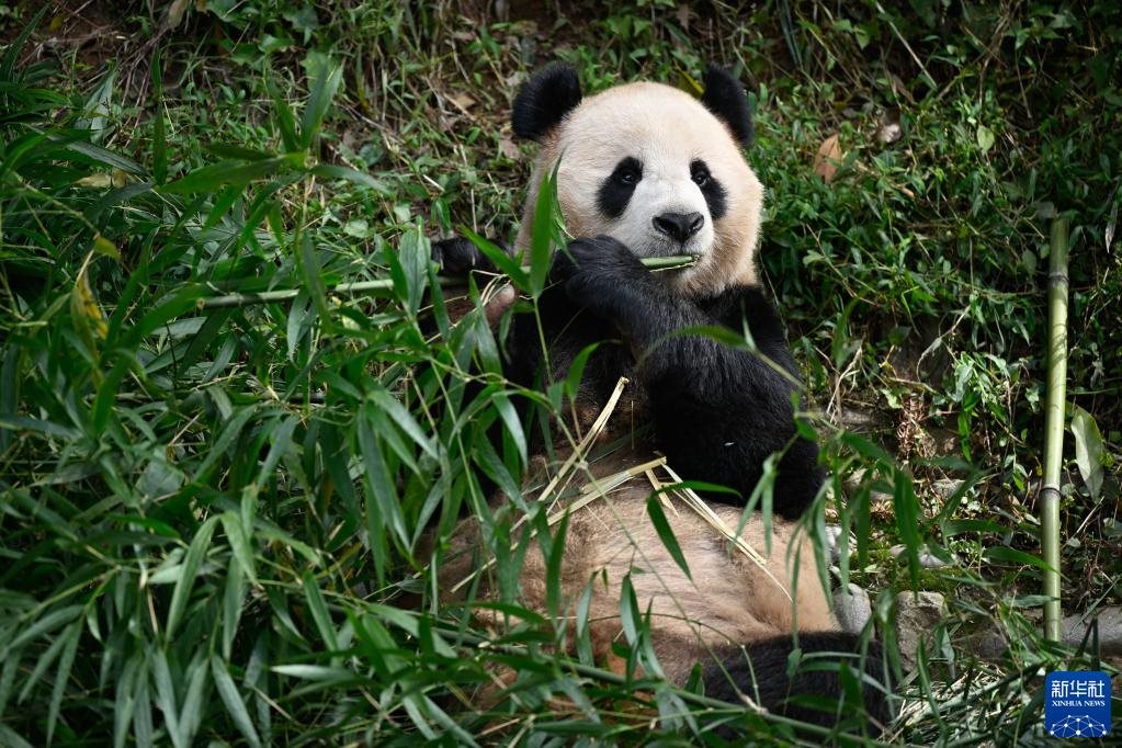 10月17日,在中國(guó)大熊貓保護(hù)研究中心雅安基地,大熊貓“四海”在吃竹子。新華社發(fā)(陳居偉 攝)