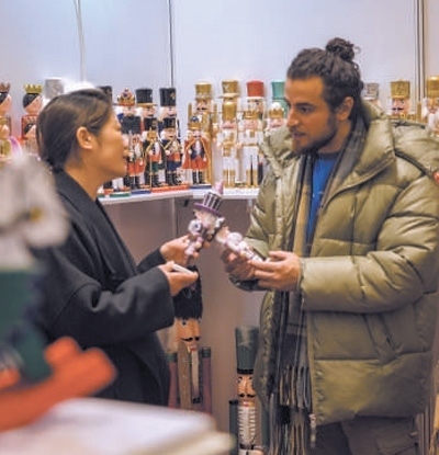 2023年2月24日,一名外商(右)正在中國(guó)(臺(tái)州)“一帶一路”跨國(guó)采購對(duì)接會(huì)上了解產(chǎn)品。章勇濤攝(人民視覺)