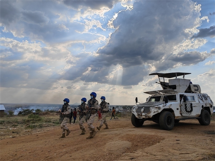 “劉老莊連”官兵在任務(wù)區(qū)執(zhí)行徒步巡邏任務(wù)。中國第九批赴南蘇丹(朱巴)維和步兵營供圖