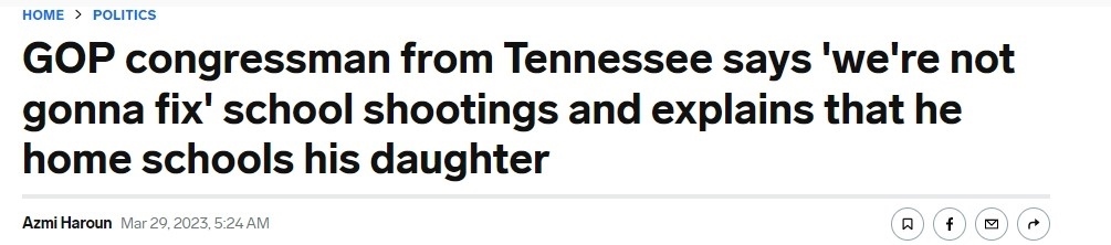 據(jù)美國《商業(yè)內(nèi)幕》新聞網(wǎng)站29日?qǐng)?bào)道,田納西州納什維爾市小學(xué)發(fā)生槍擊事件后,該州眾議院議員蒂姆·伯切特面對(duì)如果出現(xiàn)類似槍擊事件“該如何保護(hù)孩子”的質(zhì)問,直言并未找到解決方法,會(huì)讓他的女兒“在家讀書”。