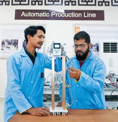 在巴基斯坦魯班工坊工業(yè)自動化和機(jī)器人專業(yè)課堂上,學(xué)生模擬實(shí)踐電梯組裝運(yùn)行技術(shù)。 巴基斯坦魯班工坊供圖