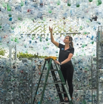 英國(guó)藝術(shù)家在倫敦動(dòng)物園打造名為“廢棄物空間”的藝術(shù)裝置,鼓勵(lì)人們停止使用一次性塑料瓶??巳R爾·多赫蒂攝(人民視覺)