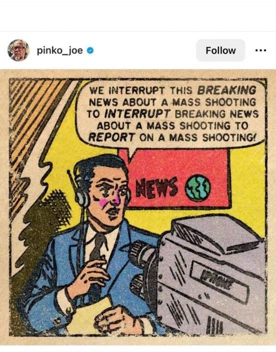 網(wǎng)友Pinko_joe的漫畫主角是一名記者,他對著鏡頭說:“下面讓我們打斷一下關(guān)于大規(guī)模槍擊的突發(fā)報(bào)道,臨時插播另一條關(guān)于大規(guī)模槍擊的突發(fā)新聞!”