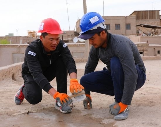 在烏茲別克斯坦希瓦古城哈桑·穆拉德庫什別吉清真寺,中方文物修復(fù)人員指導(dǎo)烏方工作人員修復(fù)清真寺屋頂。