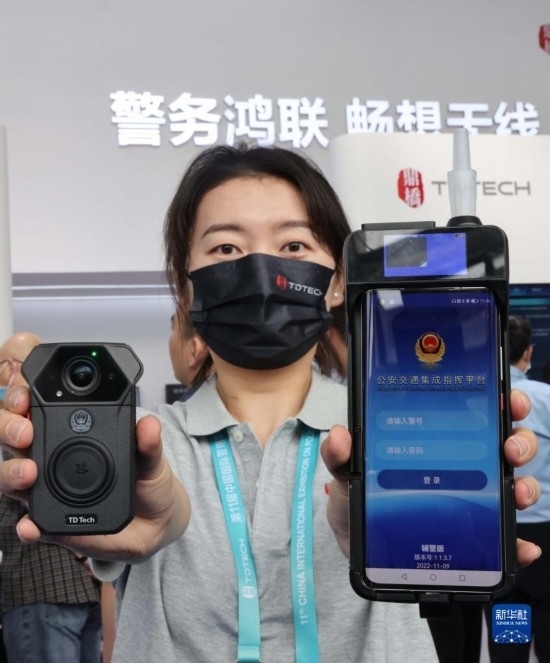 5月12日,工作人員在展示交警多功能移動(dòng)警務(wù)終端(右)和5G執(zhí)法記錄儀。
