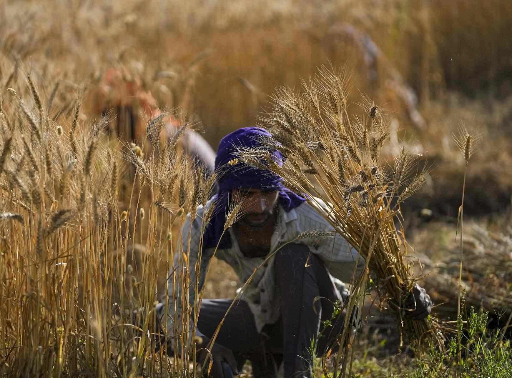 當(dāng)?shù)貢r(shí)間2023年4月24日,克什米爾查謨地區(qū),農(nóng)民在收割小麥。