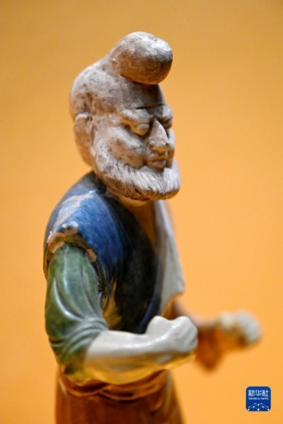 這是在西安博物院展出的唐代三彩胡人牽馬(駝)陶俑(5月8日攝)。唐代的長安城中居住著大批胡人,胡樂、胡服風(fēng)靡長安,經(jīng)考古出土的陶俑中有為數(shù)不少的胡人形象。