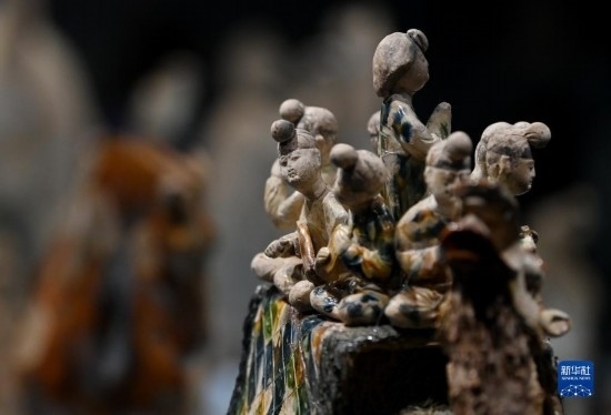 這是在陜西歷史博物館拍攝的唐三彩駱駝載樂俑(5月11日攝)。這件唐三彩駱駝載樂俑既是唐代文化藝術(shù)、制作工藝發(fā)達(dá)昌盛的重要物證,也見證了絲綢之路上藝術(shù)的交流與融合。
