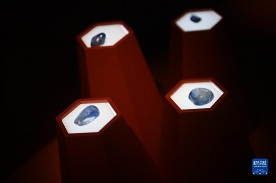 這是在陜西歷史博物館拍攝的藍(lán)寶石(5月11日攝)。天然寶石通過絲綢之路以商業(yè)貿(mào)易的形式進(jìn)入中國。