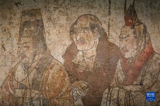 這是在陜西歷史博物館拍攝的唐章懷太子墓《客使圖》(局部)(5月11日攝)。《客使圖》描繪的是唐代外交機(jī)構(gòu)鴻臚寺官員接待外國使節(jié)的場景。